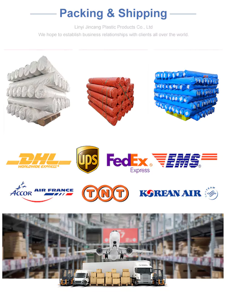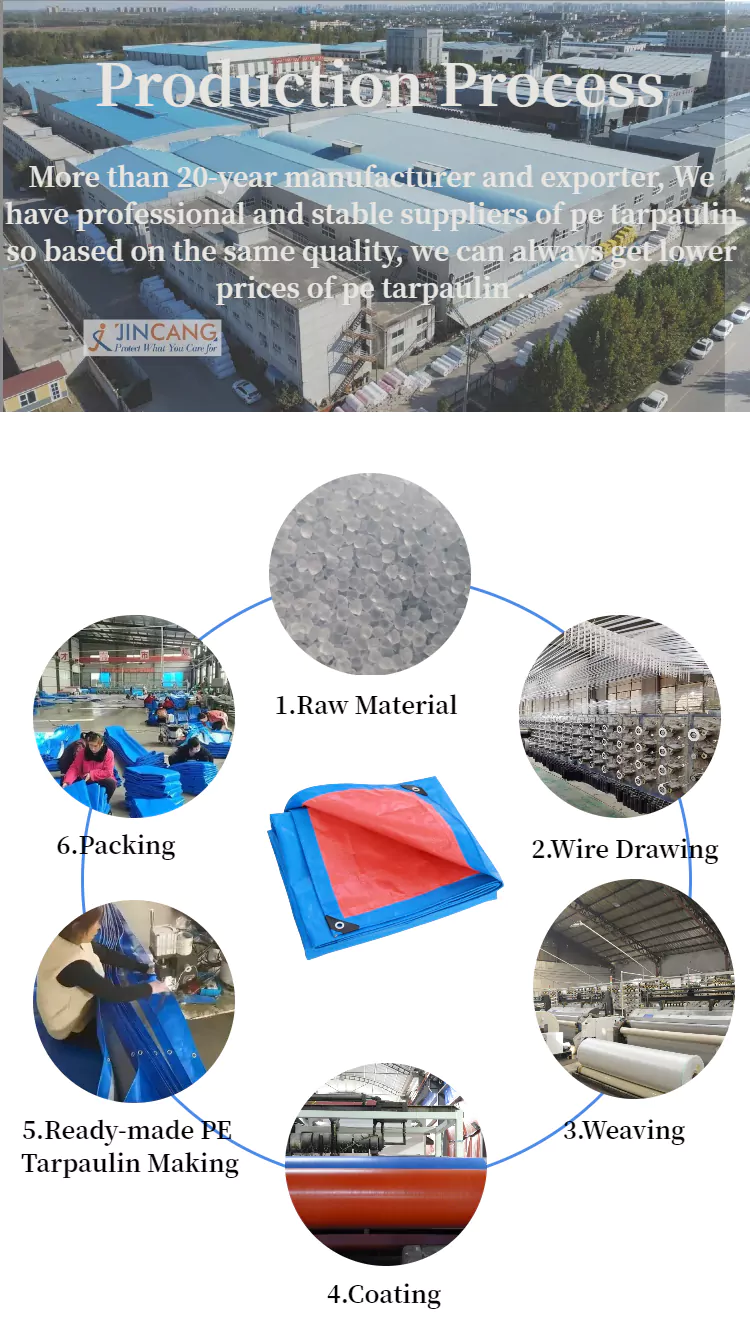 Jincang adalah salah satu produsen PE Tarpaulin Roll profesional di Cina, 90 GSM Strip PE Tarpaulin Roll dikemas demi gulungan. Lebarnya biasanya 1,83m,2m,4m,5m,6m. Panjangnya biasanya 63m,91, 100m 200m dll. Dan kami juga dapat menyesuaikan sesuai kebutuhan Anda. Ini banyak digunakan untuk perlindungan luar ruangan, meliputi barang, lokasi konstruksi, keperluan pertanian, dan tempat berlindung sementara.
